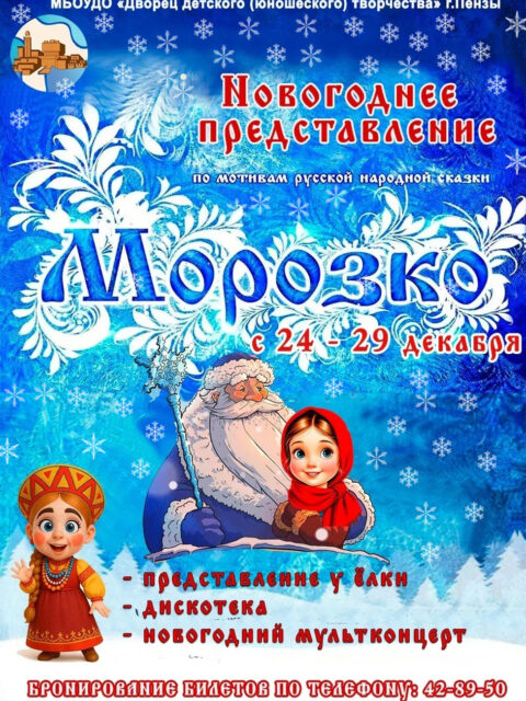 Дорогие друзья, приглашаем вас посетить новогодние представления во Дворце — по мотивам русской народной сказки «МОРОЗКО». Предлагаем вместе с нашими героями окунуться в волшебную атмосферу сказки. Вас ждут: театрализованное представление, активные игры, зажигательные танцы, дискотека, новогодний мультконцерт! Приходите, будет весело! Справки по телефону — 42-89-50.