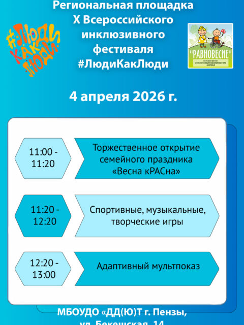 Приглашаем принять участие в семейном празднике «Весна кРАСна» региональной площадки фестиваля #ЛюдиКакЛюди, который проводится в рамках Всероссийской недели распространения информации об аутизме. 📆 Праздник состоится 4 апреля в 11:00 🏘️📍 Дворец детского (юношеского) творчества г. Пензы, ул. Бекешская, 14