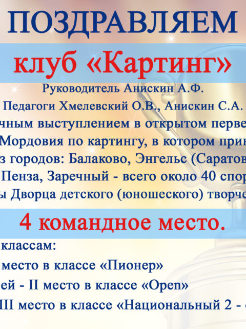 10 августа 2017 года клуб «Картинг» Дворца детского (юношеского) творчества принял участие в праздновании Дня физкультурника. Торжественное мероприятие состоялось на Юбилейной площади перед зданием Филармонии. Спортсмены клуба продемонстрировали своё мастерство. Яркое и зрелищное выступление юных картингистов не оставило никого равнодушным.