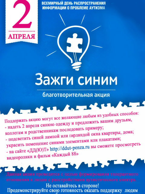 2 апреля учащиеся и родители клуба для детей с ограниченными возможностями «Равновесие» приняли участие в акции «Пенза, зажги синим», посвященной Всемирному дню распространения информации об аутизме. Данная акция прошла в нашем городе впервые. Утром в кинотеатре Высшая Лига для детей с расстройством аутистического спектра состоялся адаптивный кинопоказ «Смурфики. Затерянная деревня». […]