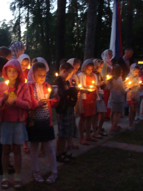 Лагерь Орлёнок. Православная смена «Ковчег». Вечером среди вековых сосен замерцали робкие огоньки свеч! Это крестный ход прошествовал по дорожкам лагеря. Размеренное пение молитв, дрожащее мерцание маленьких язычков пламени, всеобщее единение, вот что увезут в своей душе ребята из Ковчега.