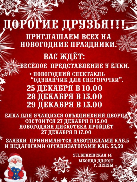 30 декабря 2015г. во Дворце закончились Новогодние представления с Барабашкой Яшкой и спектакль «Одуванчик для Снегурочки». Праздники получились яркими, веселыми, озорными. Зрители оставили много положительных отзывов о мероприятиях. Администрация ДД(Ю)Т от всей души благодарит творческие коллективы детей, педагогов и родителей, участвующих в представлениях. Желаем всем сказочного новогоднего настроения, здоровья и […]