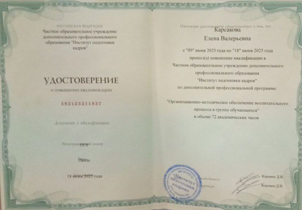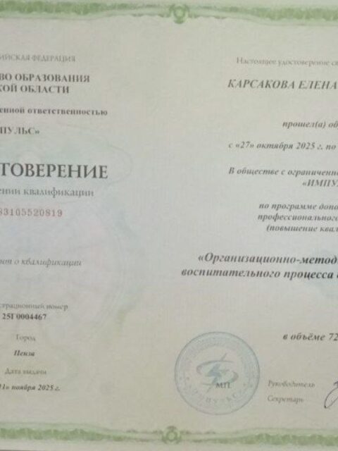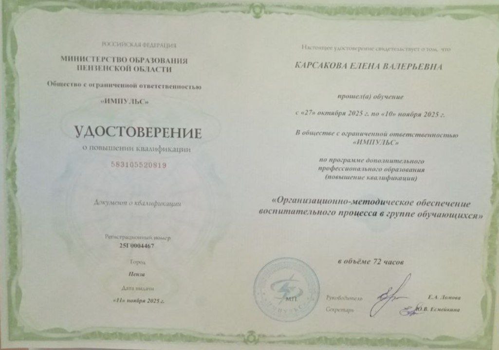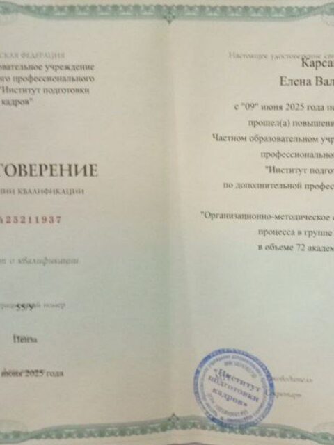 В 2015 году прошла профессиональную переподготовку в «Пензенском многопрофильном колледже» получила право на ведение профессиональной деятельности в сфере «Педагогика дополнительного образования»