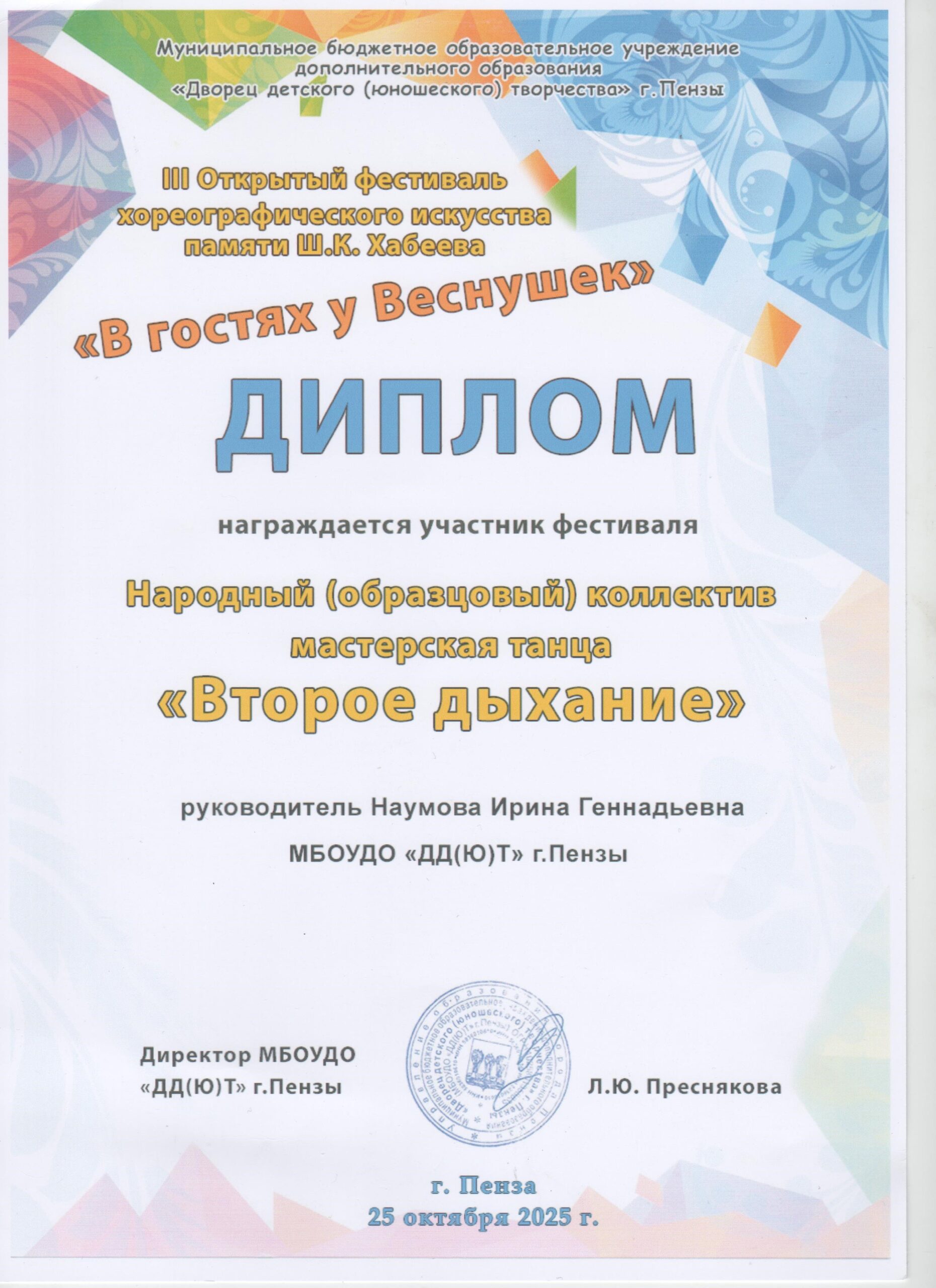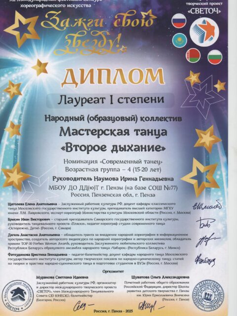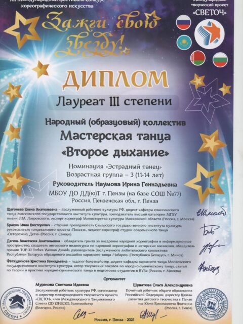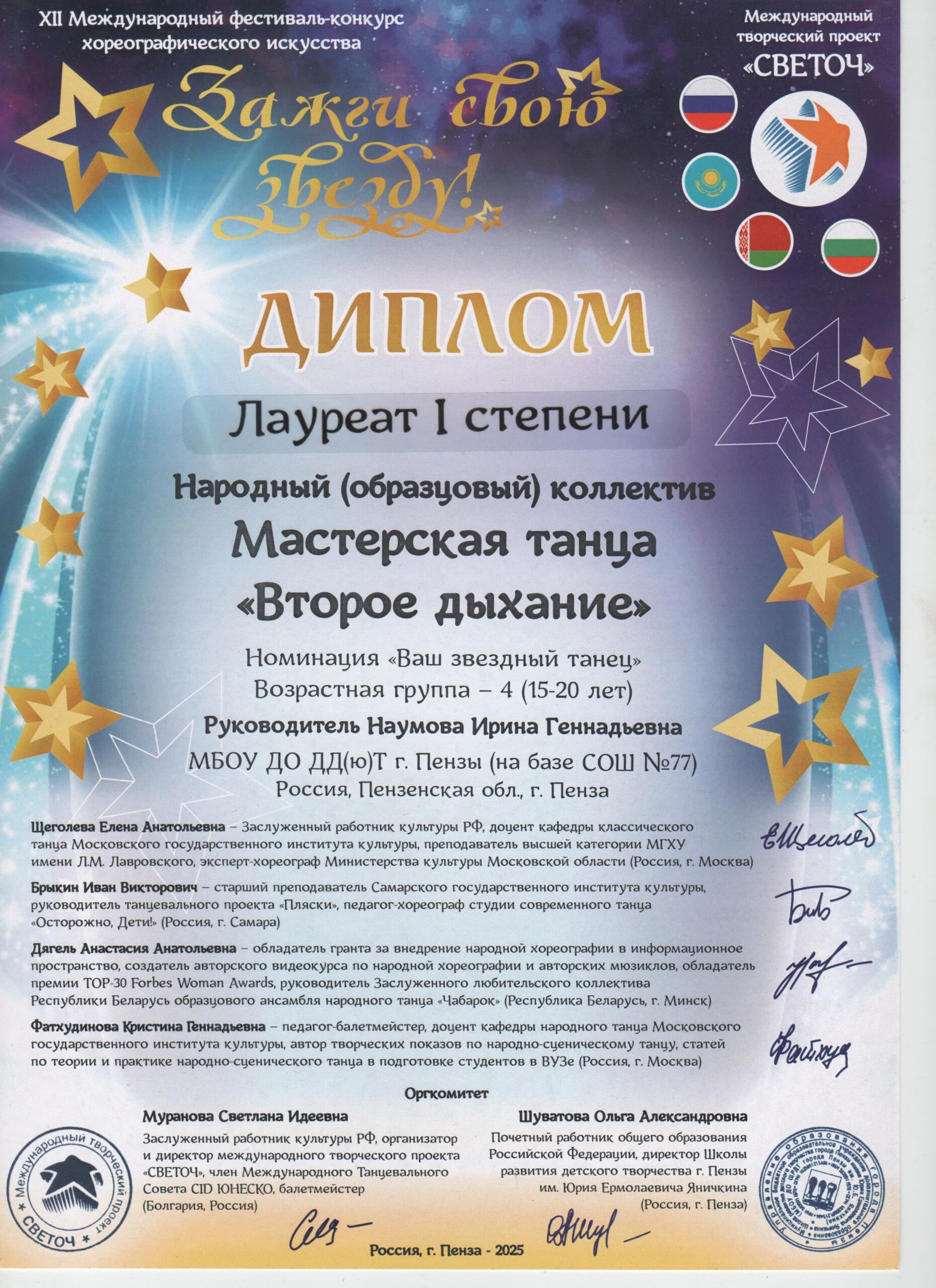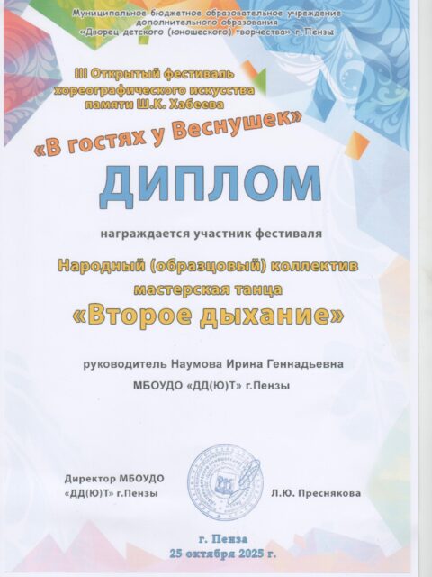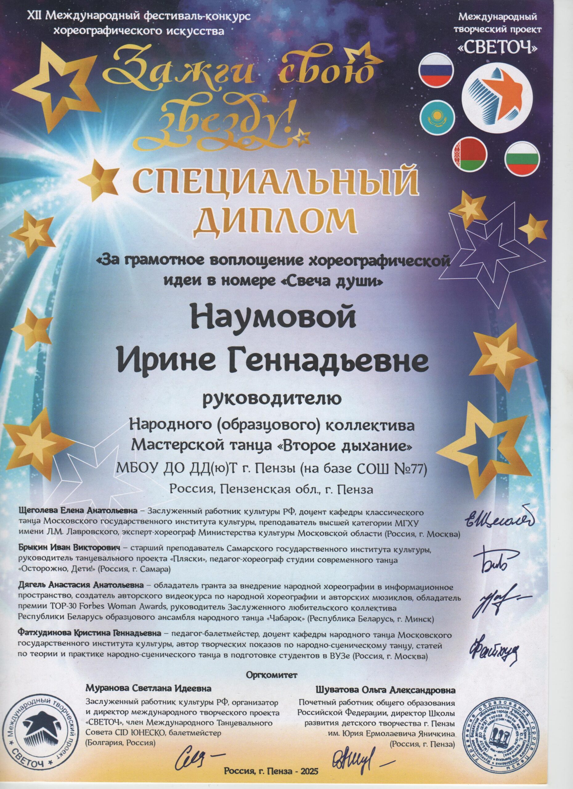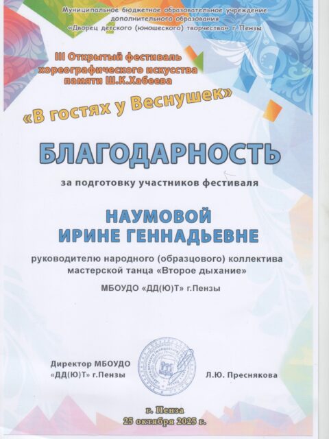 Наумова Ирина Геннадьевна в 1989 году закончила РФ Московского Государственного института культуры . С 1996 года- на должности педагога дополнительного образования, имеет высшую квалификационную категорию. С 2010 года является руководителем Народного (образцового) коллектива мастерская танца «Второе дыхание», который творчески развивается в эстрадном и современных направлениях.