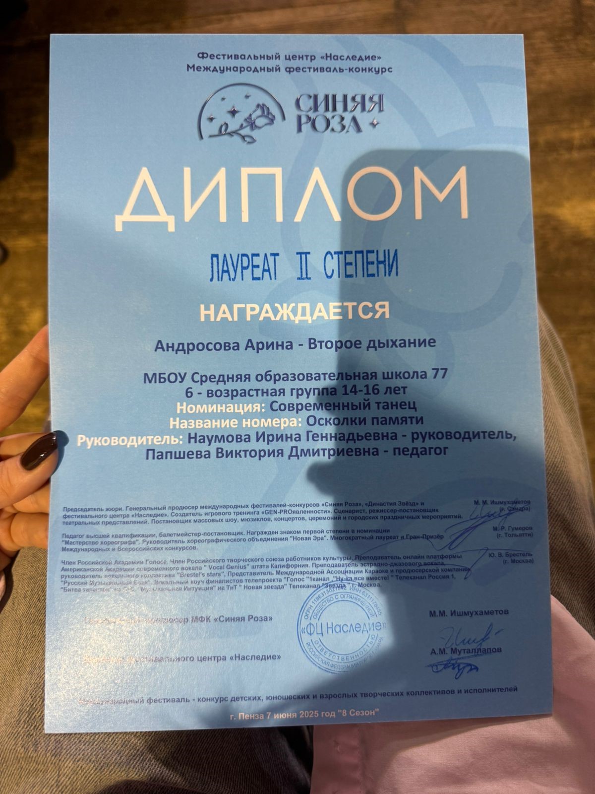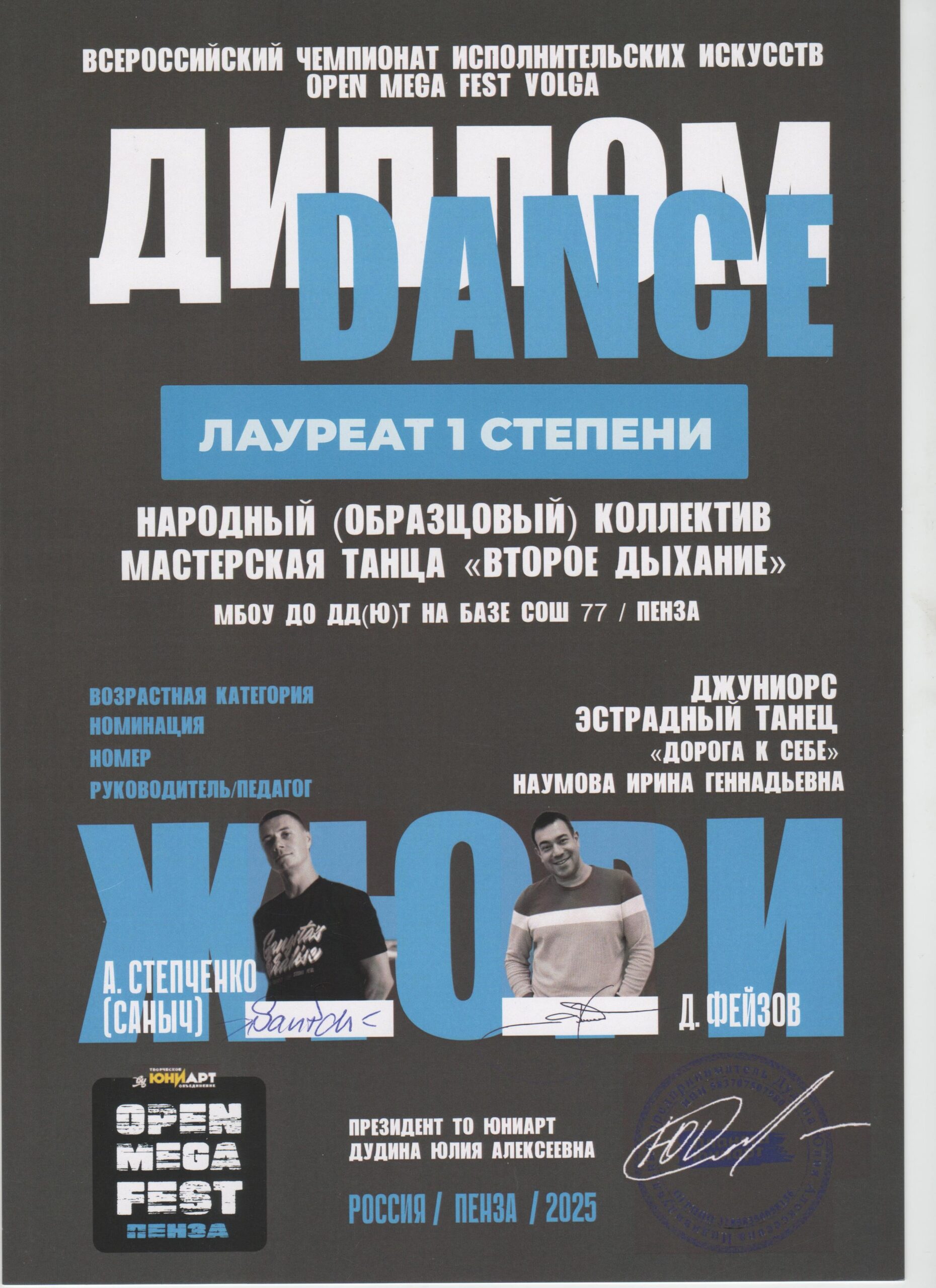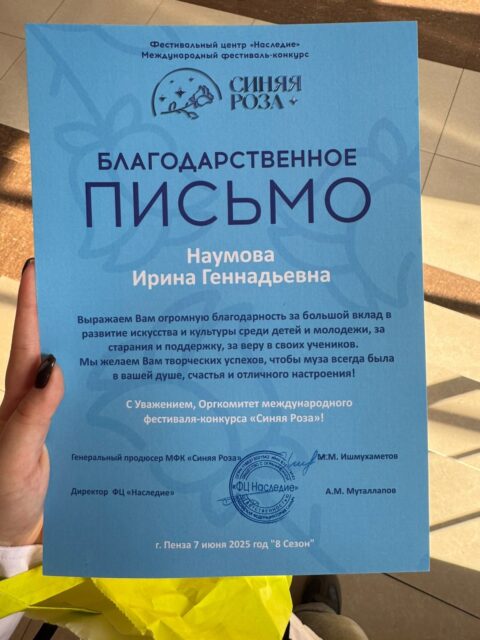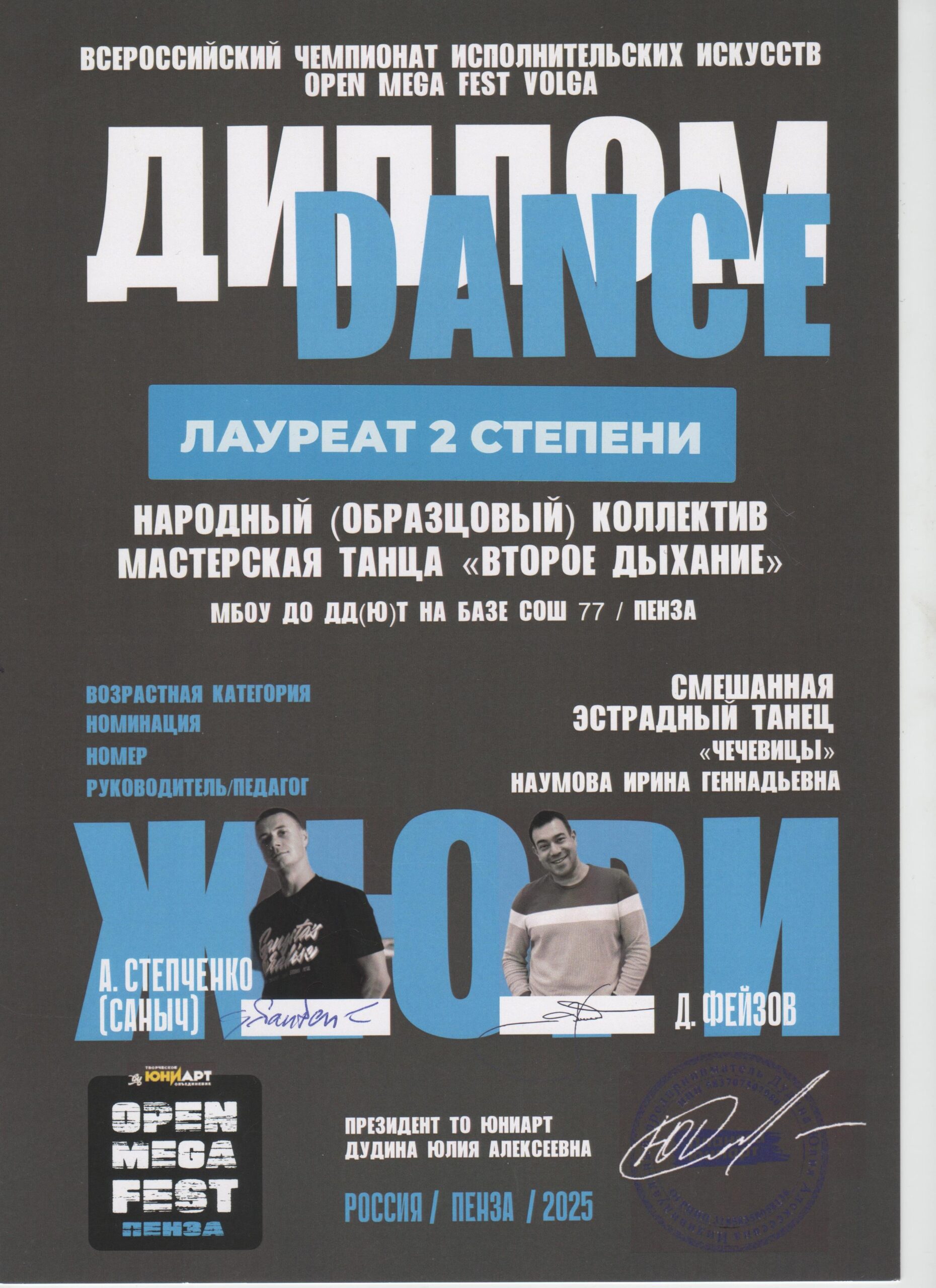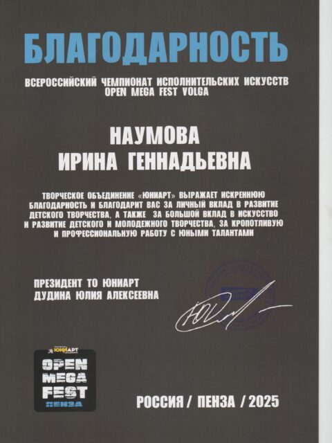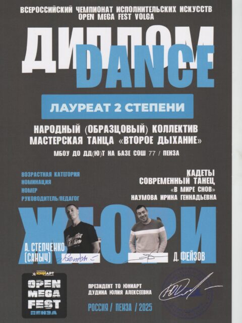 Наумова Ирина Геннадьевна в 1989 году закончила РФ Московского Государственного института культуры . С 1996 года- на должности педагога дополнительного образования, имеет высшую квалификационную категорию. С 2010 года является руководителем Народного (образцового) коллектива мастерская танца «Второе дыхание», который творчески развивается в эстрадном и современных направлениях.