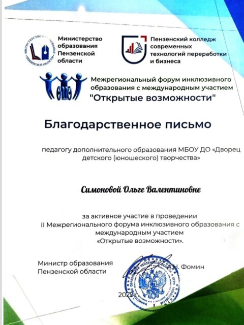 1996г., ПГПУ им. В.Г. Белинского по специальности «Педагогика и методика начального обучения», учитель начальных классов;