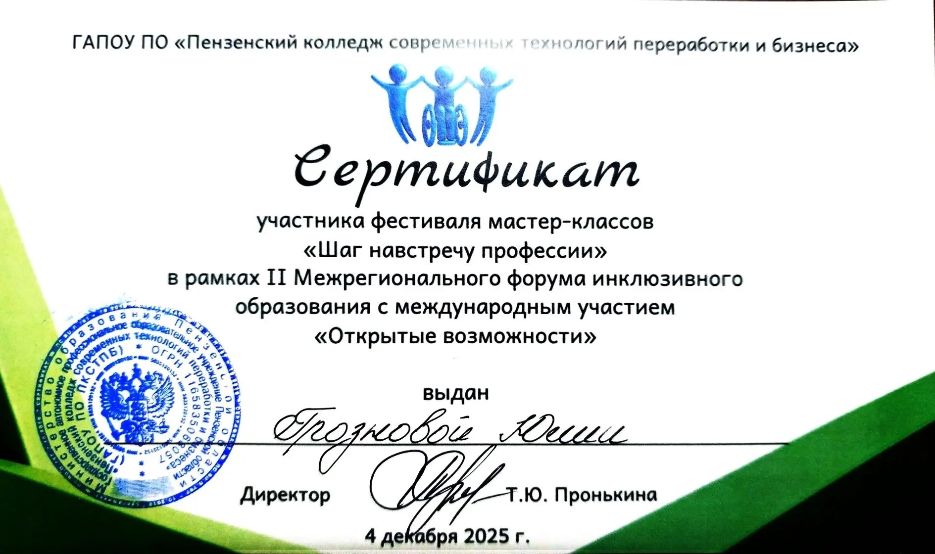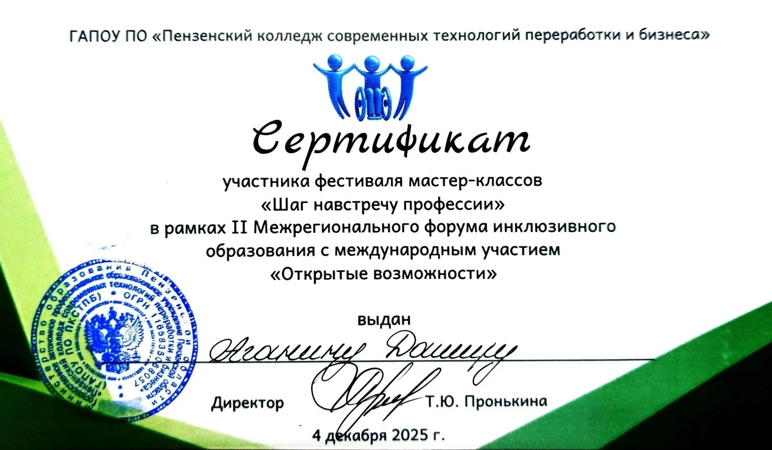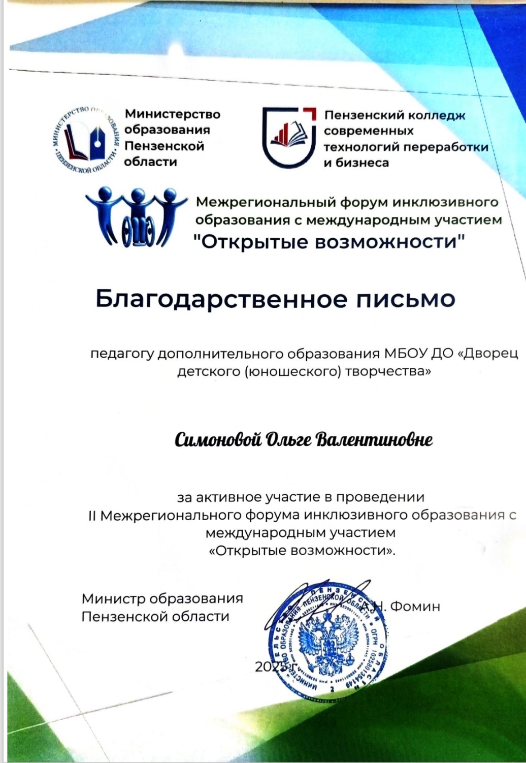 1996г., ПГПУ им. В.Г. Белинского по специальности «Педагогика и методика начального обучения», учитель начальных классов;