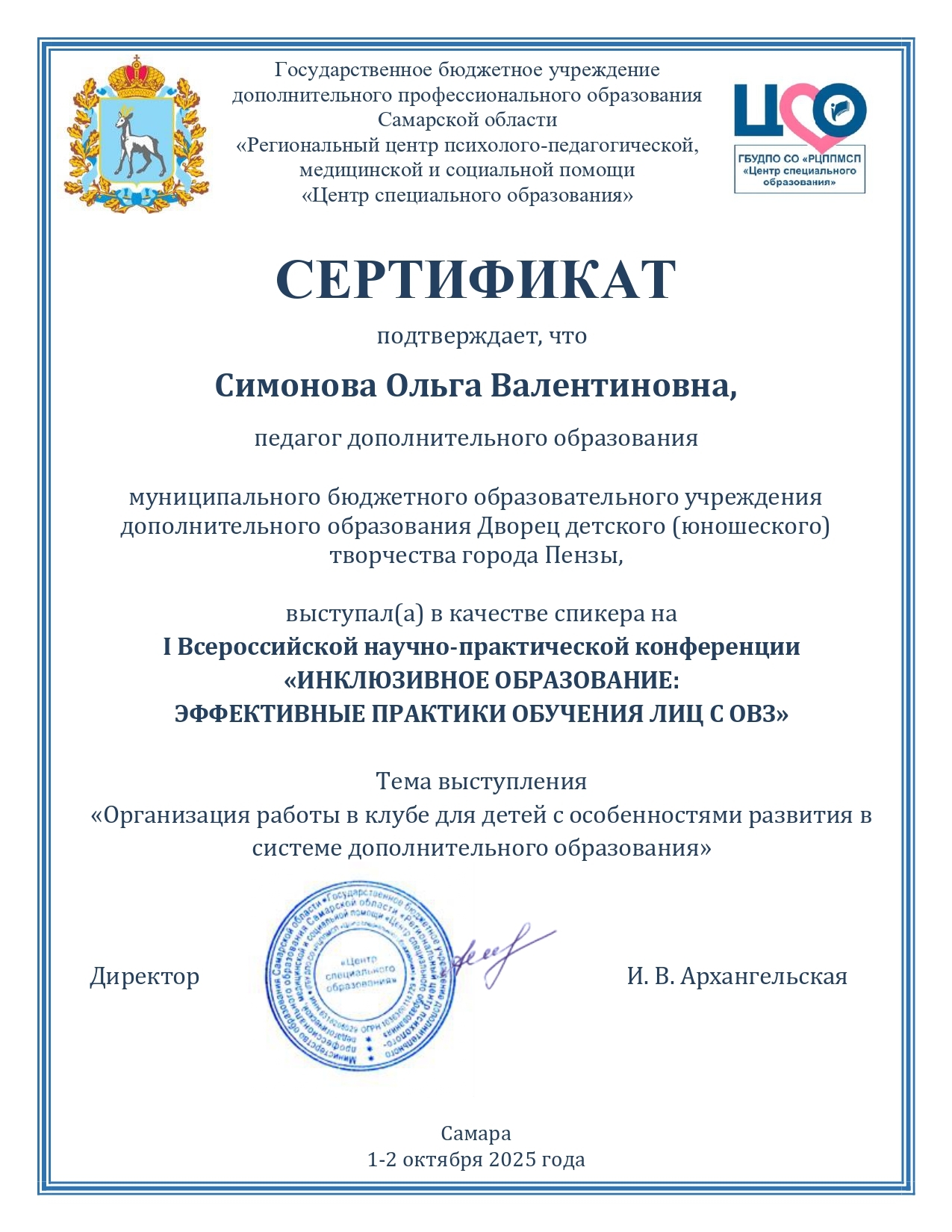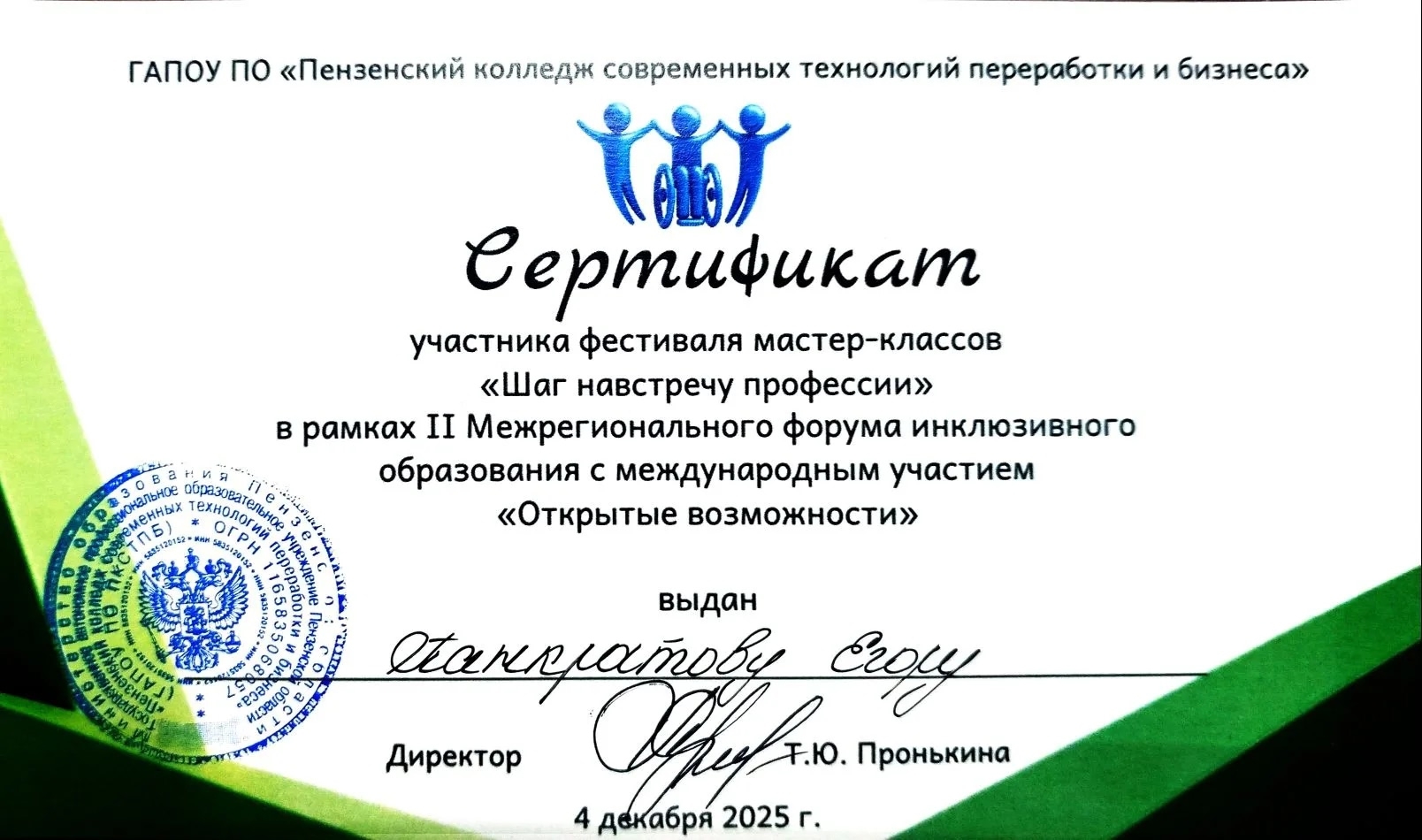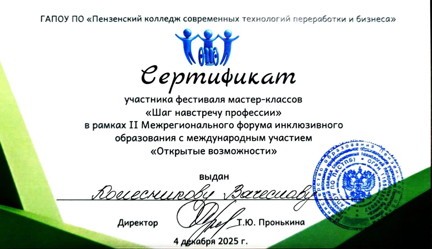 1996г., ПГПУ им. В.Г. Белинского по специальности «Педагогика и методика начального обучения», учитель начальных классов;