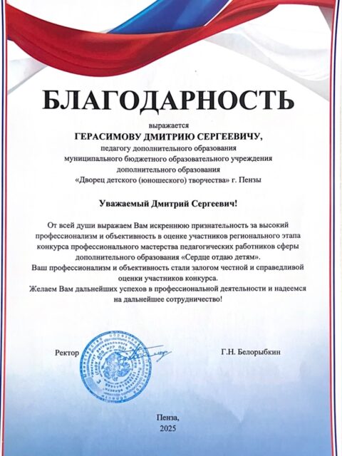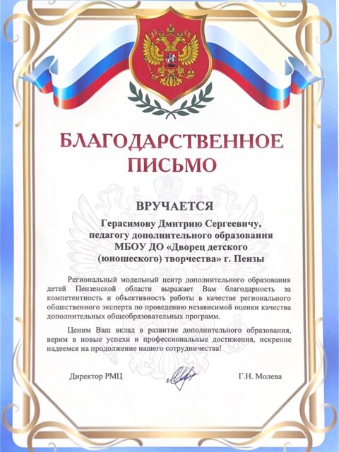 Учащаяся объединения Кристина Петрова была удостоена грамотой за высокие достижения в ДД(Ю)Т г. Пенза.
