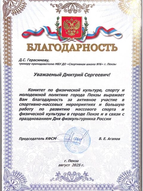высшее образование с отличием, магистр. Пензенский государственный университет, Институт физической культуры и спорта. (Профиль: Подготовка спортсменов на тренировочном этапе и этапах совершенствования спортивного мастерства). 2024 г.