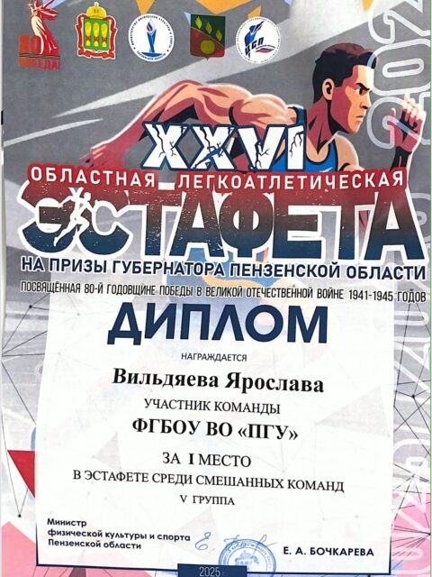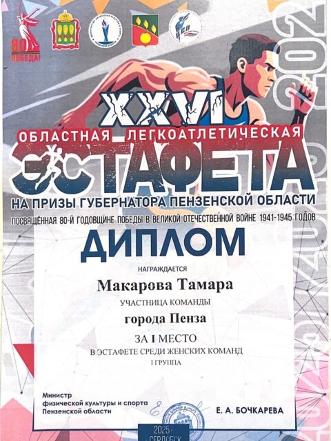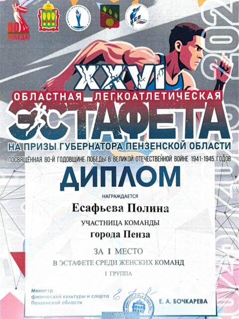 Учащаяся объединения Кристина Голоева стала победителем первого этапа в городской легкоатлетической эстафете, посвященной памяти Отличника физической культуры Г.П.Мурашкина в рамках 76-ой годовщине Победы в Великой Отечественной войне 1941-1945 г. Также была удостоена грамотой за высокие достижения в ДД(Ю)Т г. Пенза.