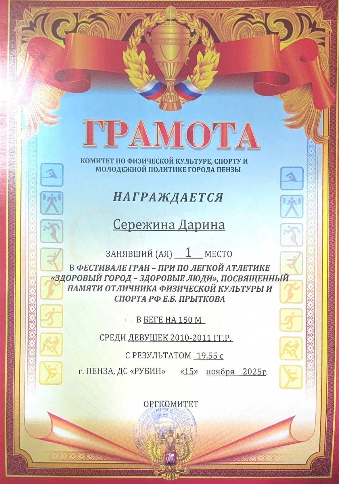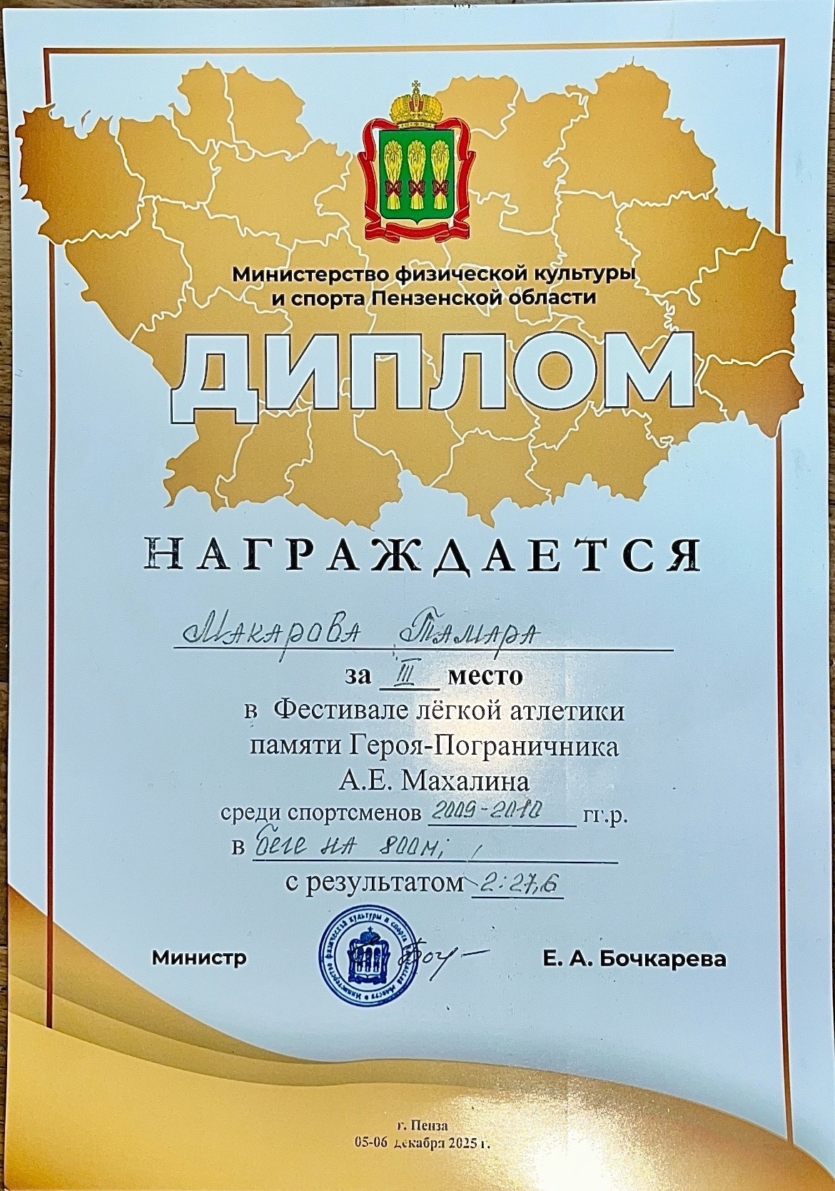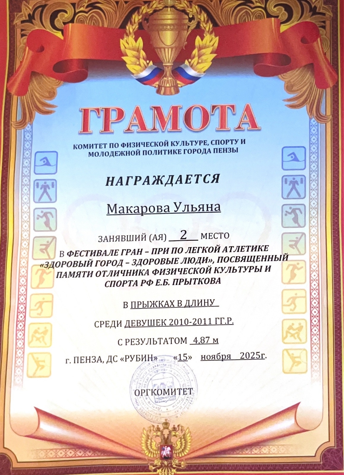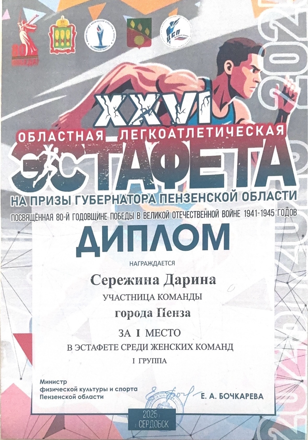 4 девочки и 1 мальчик вошли в состав сборной Пензенской области по легкой атлетике и выступали в составе сборной области на Всероссийских соревнованиях.