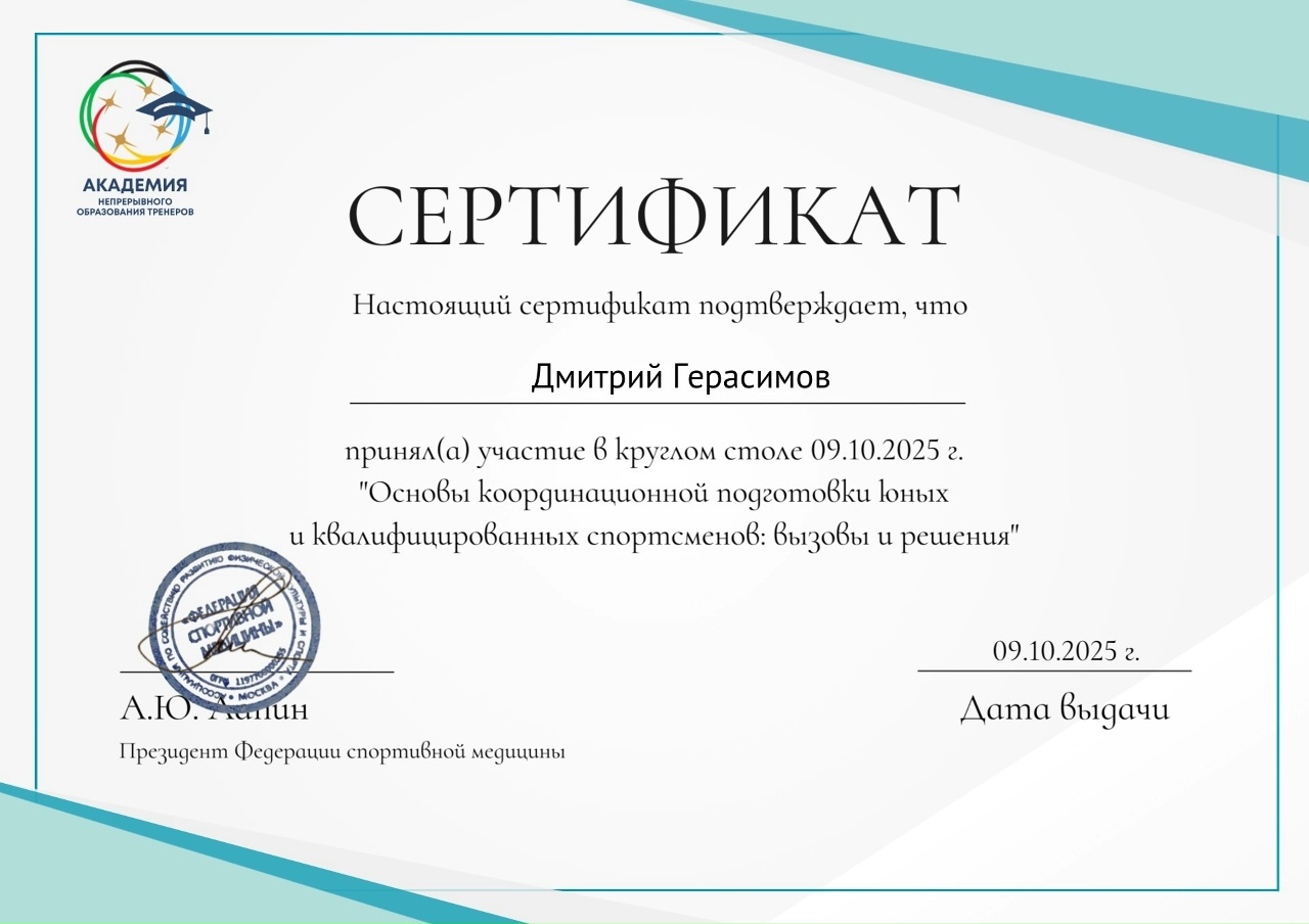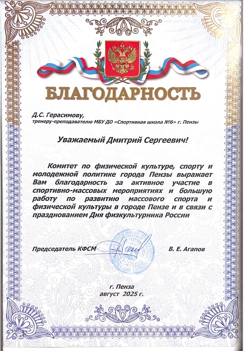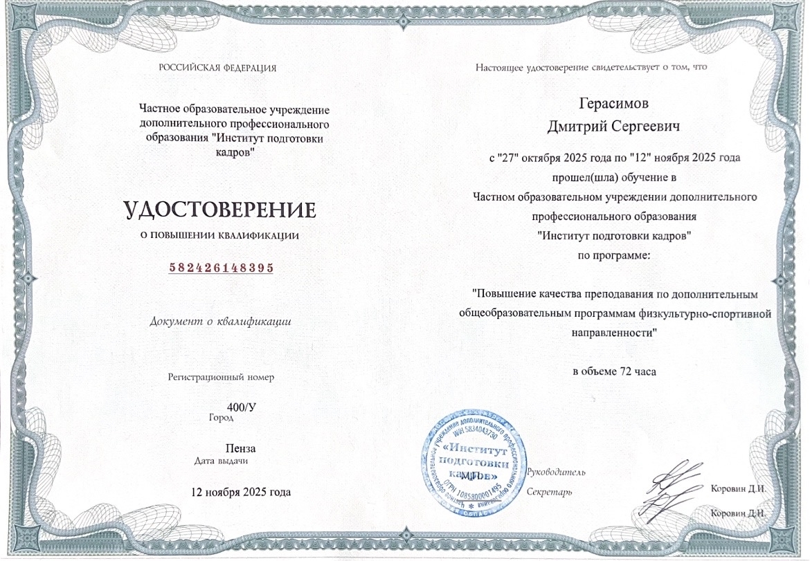 высшее образование с отличием, магистр. Пензенский государственный университет, Институт физической культуры и спорта. (Профиль: Подготовка спортсменов на тренировочном этапе и этапах совершенствования спортивного мастерства). 2024 г.