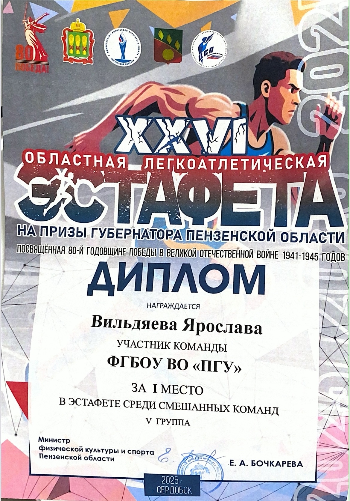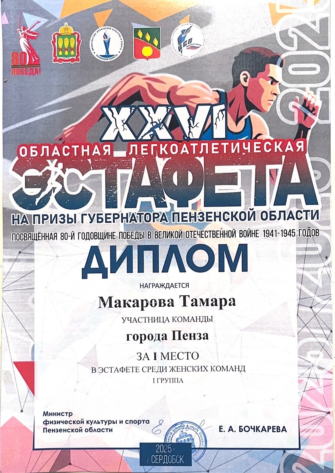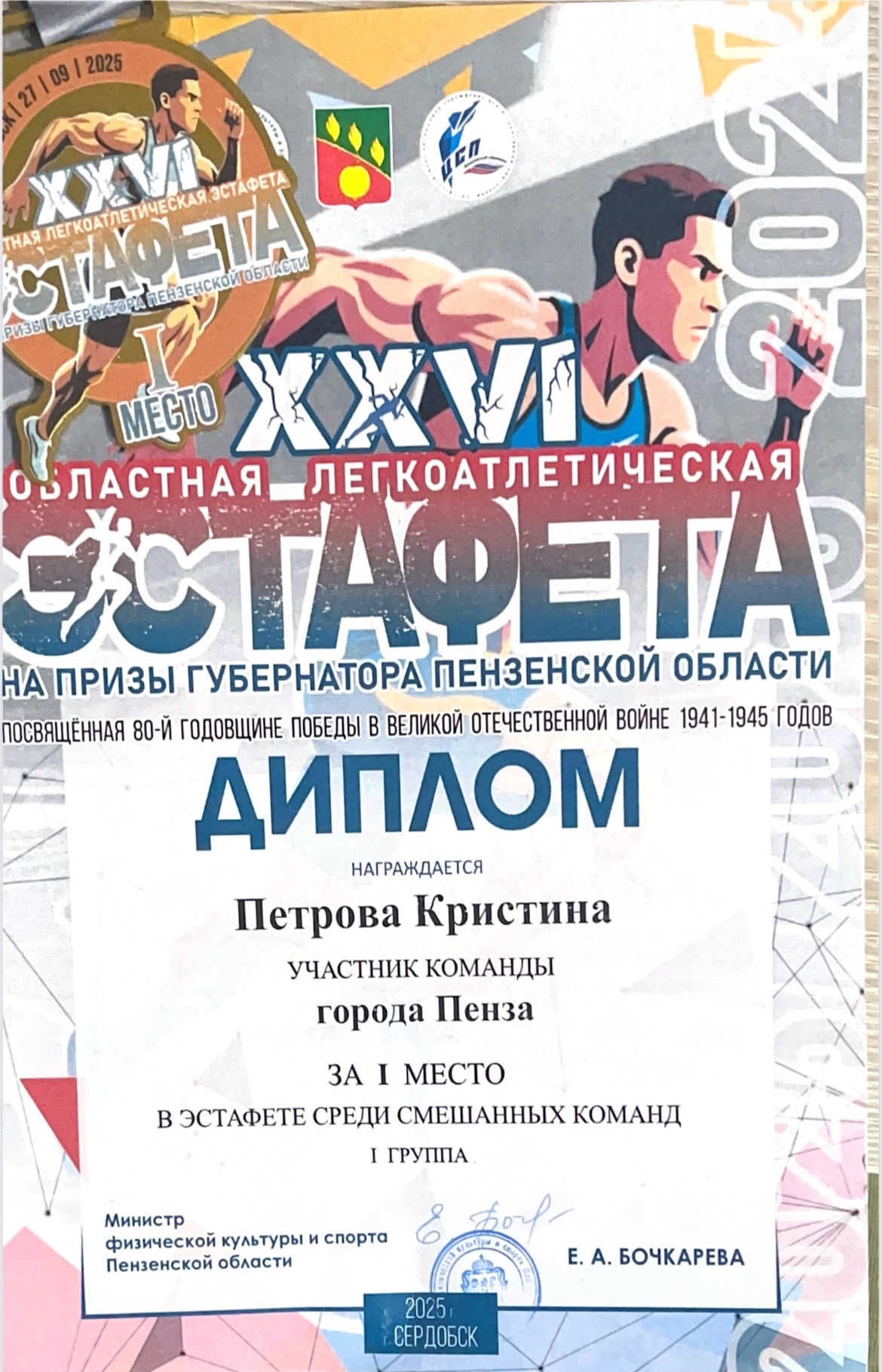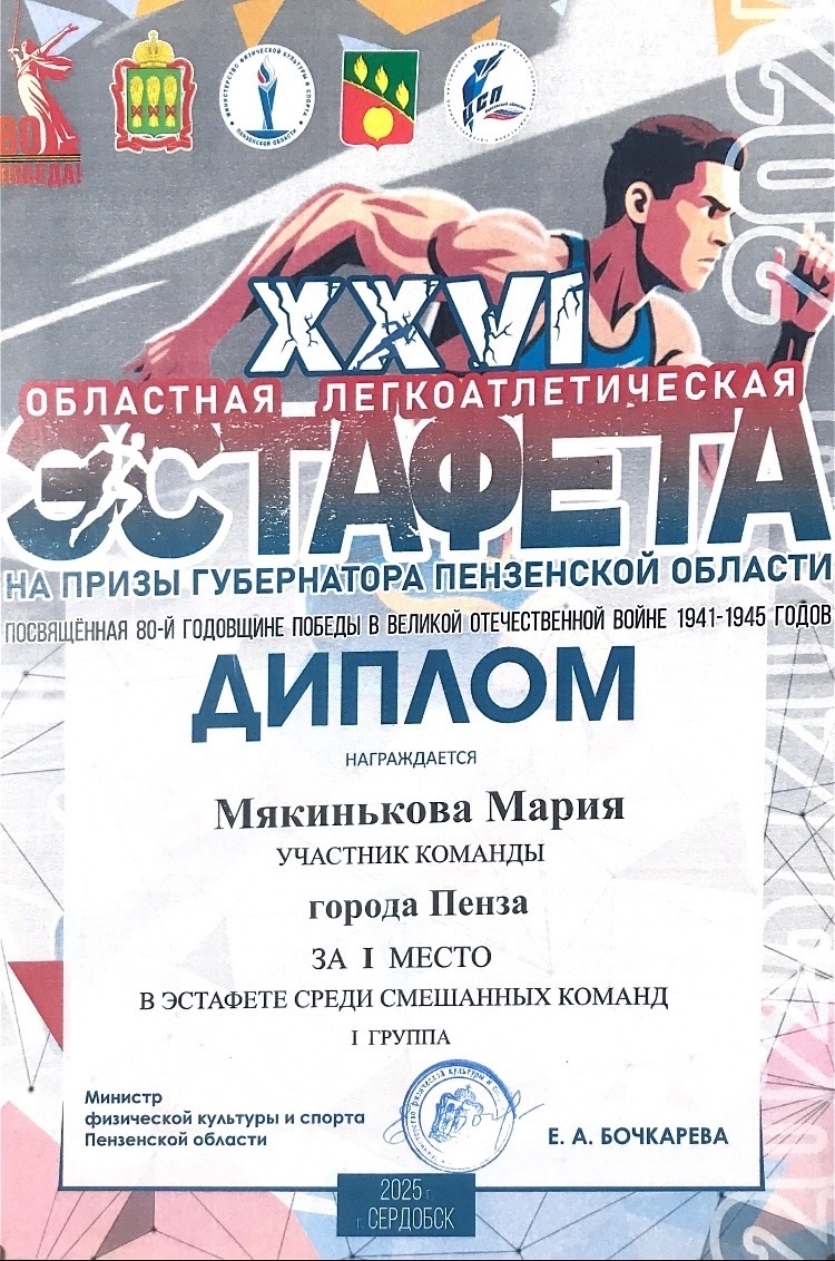 Учащаяся объединения Кристина Голоева стала победителем первого этапа в городской легкоатлетической эстафете, посвященной памяти Отличника физической культуры Г.П.Мурашкина в рамках 76-ой годовщине Победы в Великой Отечественной войне 1941-1945 г. Также была удостоена грамотой за высокие достижения в ДД(Ю)Т г. Пенза.