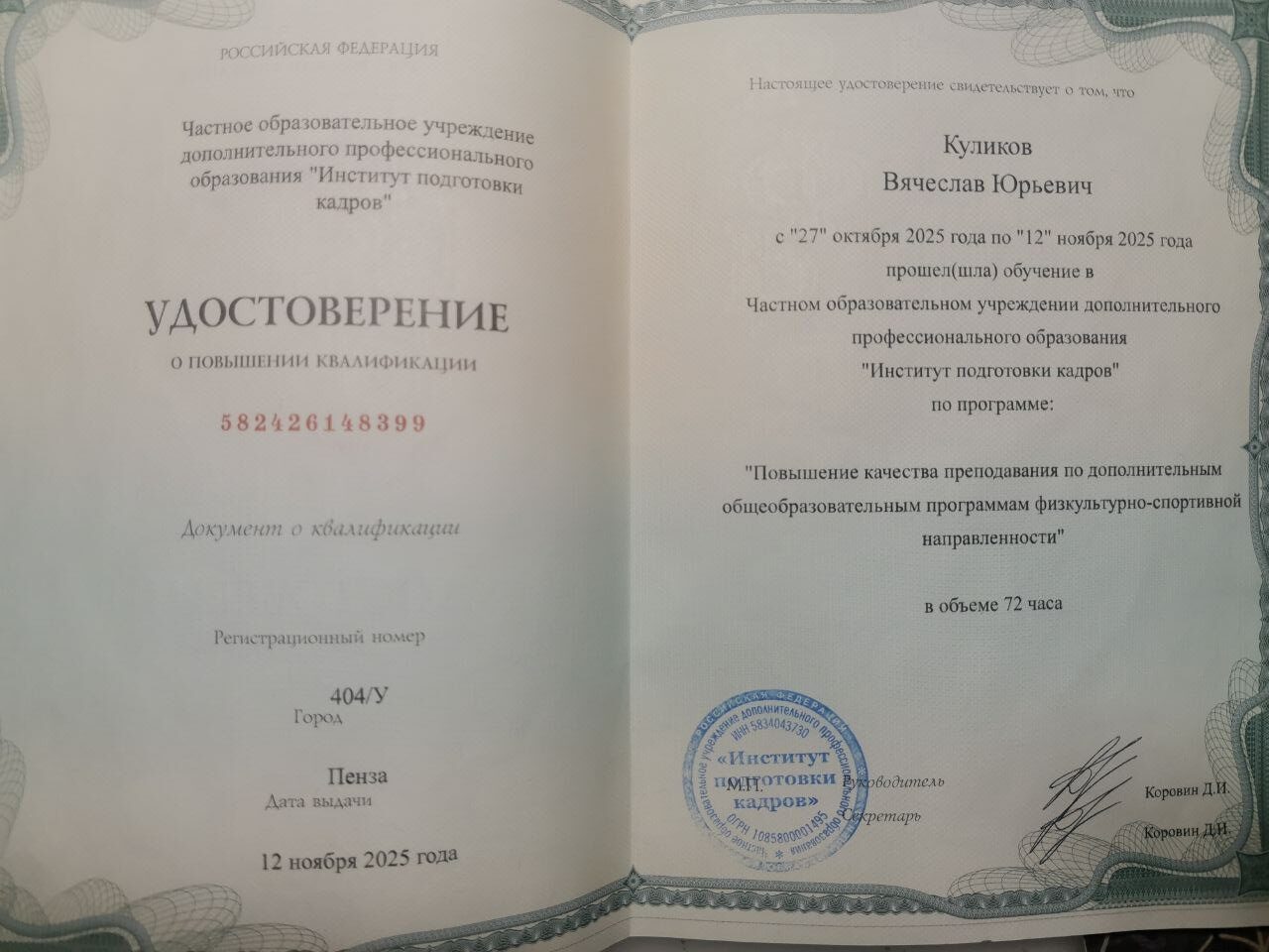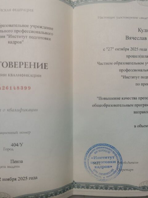 Информация о прохождении курсов повышения квалификации, участии в обучающих семинарах и мастер-классах (прикрепляется скан удостоверения, свидетельства, сертификат участника).